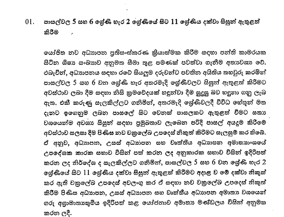 පාසල්වල 2 ශ්රේණියේ සිට 11 ශ්රේණිය දක්වා 5 සහ 6 ශ්රේණි හැර අතරමැද පන්ති සඳහා සිසුන් ඇතුළත් කිරීමට නව චක්රලේඛයක් නිකුත් කිරීමට අමාත්ය මණ්ඩල අනුමැතිය හිමිව තිබෙනවා.