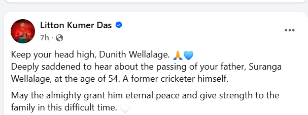 මේ අතර බංග්ලාදේශ විස්සයි20 නායක ලිටන් දාස් සිය ෆේස්බුක් ගිණුමේ සඳහන් කර ඇත්තේ ‘ ඔබේ පියා වන සුරංග වෙල්ලාලගේ වයස අවුරුදු 54 දී අභාවප්රාප්ත වීම ගැන අසා අතිශයින් කණගාටුයි. ඔහු හිටපු ක්රිකට් ක්රීඩකයෙකි.