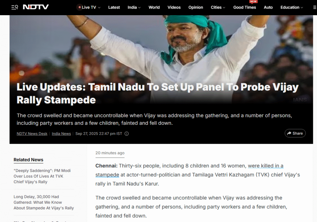 විජේ විසින් තමිල්නාඩුවේ කරූර් හි සංවිධානය කර තිබූ දේශපාලන රැලියක තෙරපීමක් නිසා 36දෙනෙකු මිය ගොස් ඇති බව විදෙස් මාධ්ය වාර්තා කර තිබෙනවා.